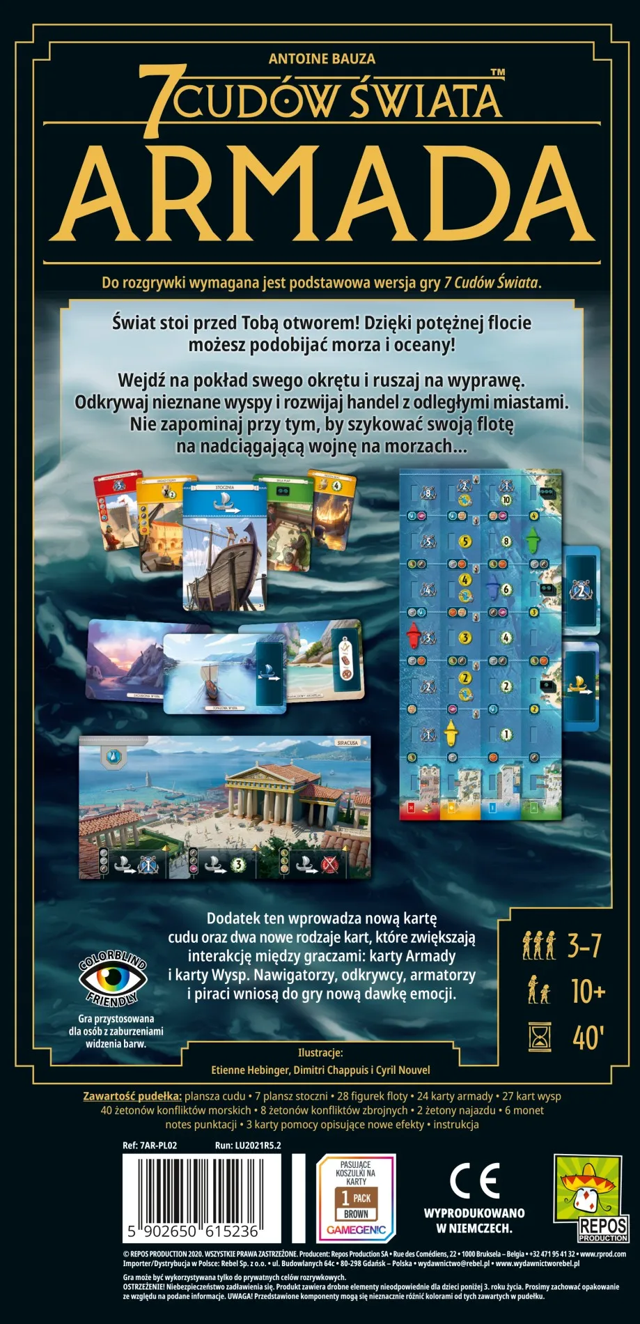 Podnieś kotwicę i przygotuj się na podbój mórz! 7 Cudów Świata: Armada to najbardziej ambitne rozszerzenie w nowej edycji, które drastycznie zmienia dynamikę stołu. Jeśli do tej pory Twoje imperium skupiało się wyłącznie na sąsiadach, teraz musisz przygotować się na interakcję z każdym uczestnikiem zabawy. Nowe stocznie, floty i nieodkryte wyspy sprawią, że Twoja cywilizacja stanie się morską potęgą.