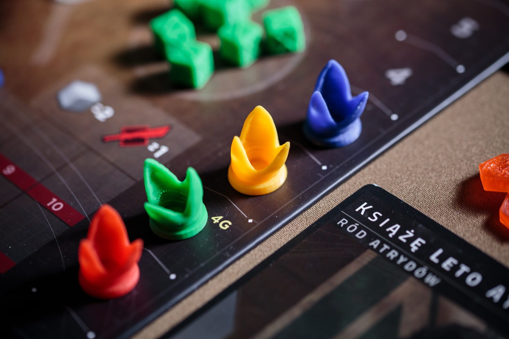 Zestaw znaczników graczy 3D mogących służyć jako zamiennik do gry Diuna: Imperium (gra podstawowa).