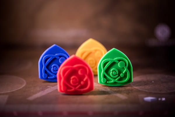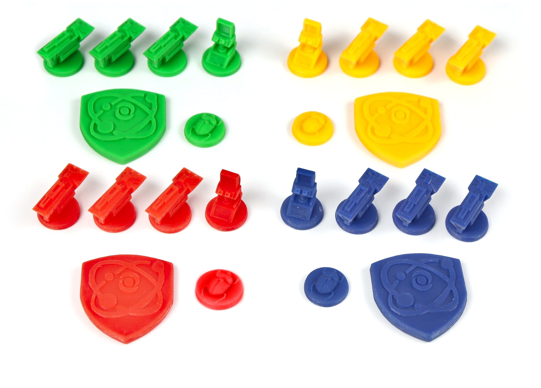 - 4 znaczniki rodowej broni atomowej (po 1 w każdym kolorze)