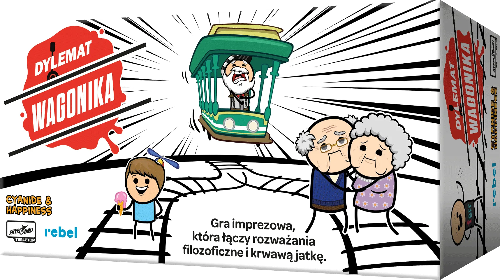 Czy kiedykolwiek zastanawiałeś się, kogo ocalić: grupę niewinnych przedszkolaków czy wynalazcę leku na raka, który w wolnych chwilach kopie szczeniaki? Dylemat wagonika to bezlitosna gra imprezowa od twórców kultowego komiksu Cyanide and Happiness, która zamienia klasyczny eksperyment myślowy w festiwal cynizmu, trudnych wyborów i salw śmiechu.