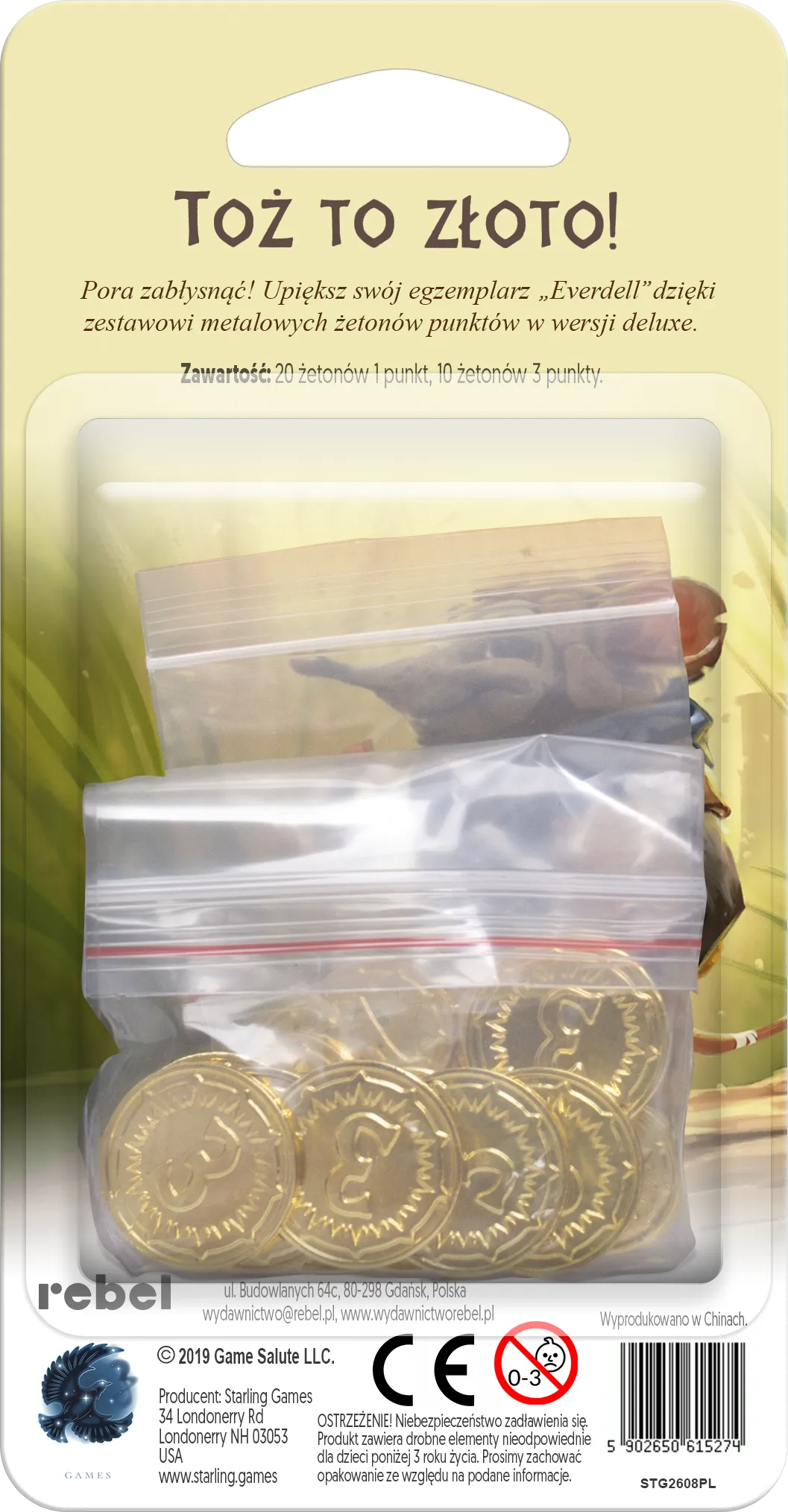 Standardowe elementy gry Everdell słyną z oszałamiającej oprawy graficznej. Metalowe monety są naturalnym dopełnieniem tej wysokiej jakości: