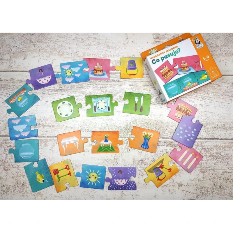 Co pasuje? Układanki malucha skupią uwagę dzieci, pozwolą rozwijać wiedzę o świecie, odszukiwać elementy i dopasowywać je do siebie. Puzzle przedstawiają przedmioty z najbliższego otoczenia maluszka. Podczas zabawy dzieci poszukają odpowiedzi na pytania: