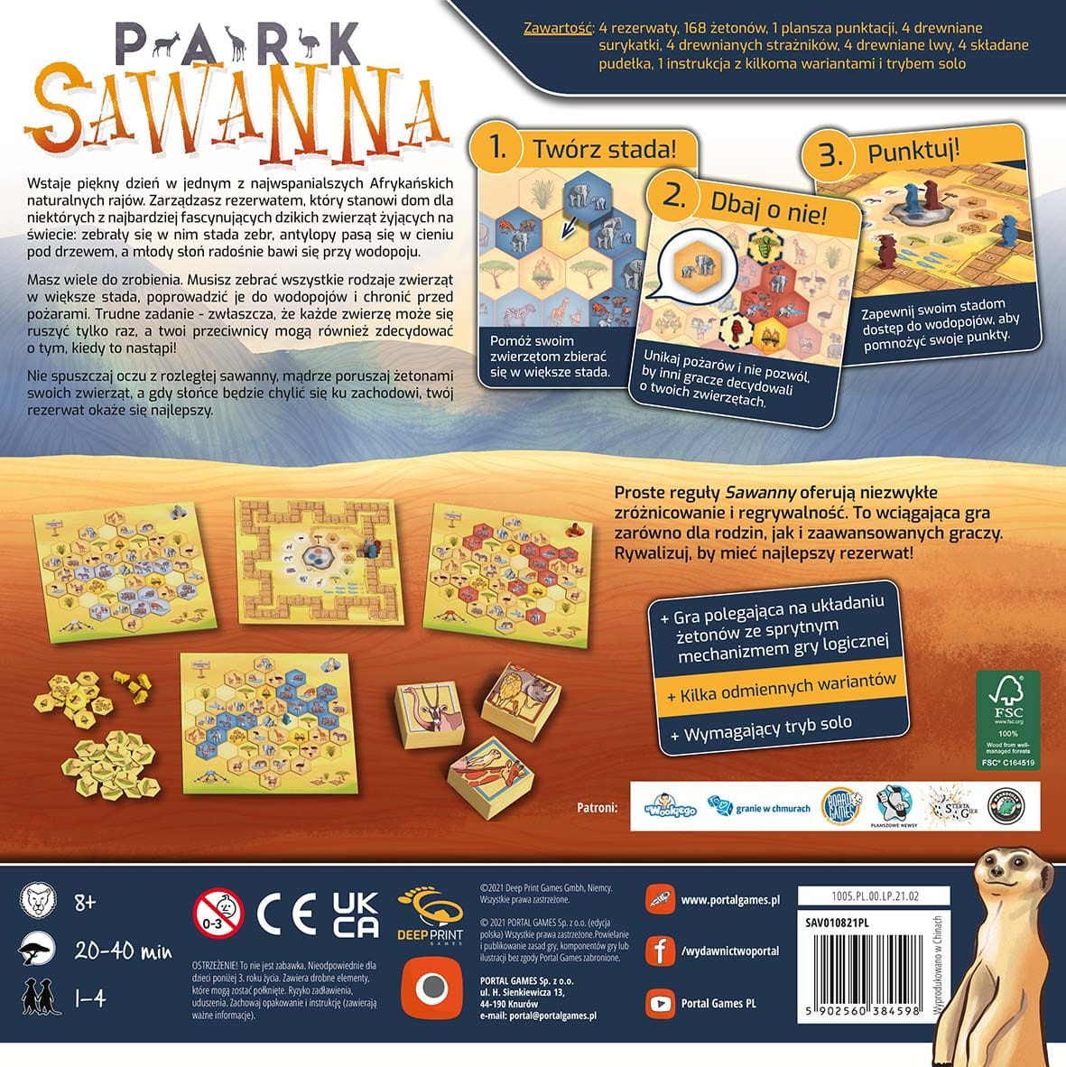 Przenieś się w samo serce Afryki i zostań strażnikiem rezerwatu, opiekując się dziką fauną i florą! Park Sawanna to szybka familijna gra planszowa stworzona przez legendarny duet, Michaela Kieslinga (Azul) i Wolfganga Kramera (Bolidy). Czas stać się obrońcą zwierząt!