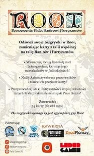Despotyczna Markiza de Kot nadal niepodzielnie rządzi w Leśnogrodzie… ale już niedługo. Jej przeciwnicy ponownie stają do walki. Myszy, lisy i króliki są teraz bardziej doświadczeni. Wiedzą, że do pokonania śmiertelnego wroga potrzeba ostatecznych środków… Talia Banitów i Partyzantów to kolejny dodatek do kultowej gry Root, który zupełnie zmienia strategię rozgrywki, czyniąc ją bardziej nieprzewidywalną i interaktywną!