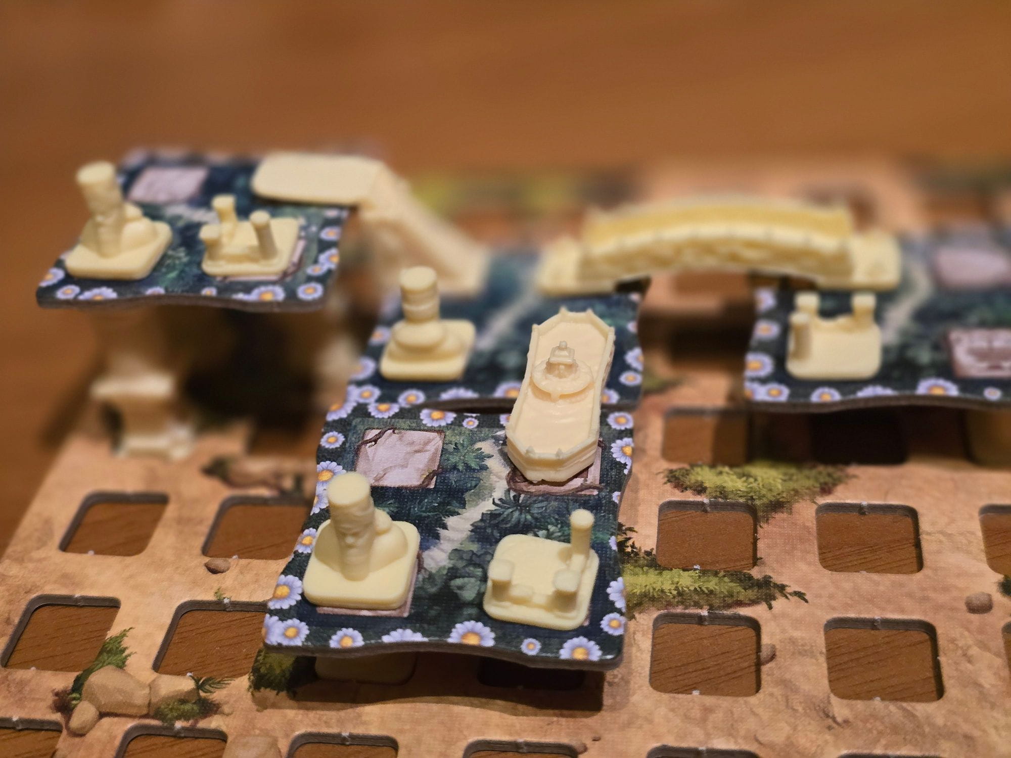 W centrum stołu umieszczana jest pudełko będące planszą symbolizująca kamieniołom – to stąd czerpiesz płytki Tarasów, które będą podstawą Twoich konstrukcji. W zależności od wybranego pola otrzymasz różną liczbę filarów, które posłużą do budowania struktur na Twojej planszy gracza.