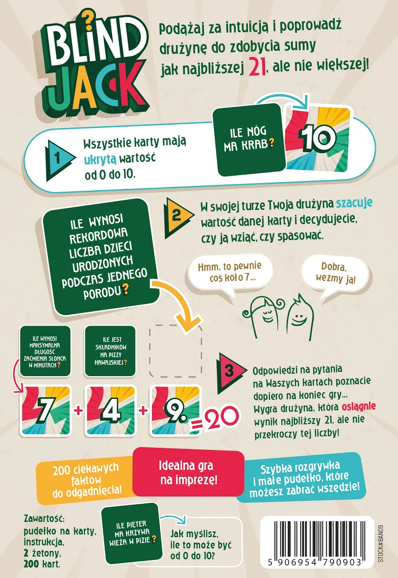 Przygotuj się na quiz, jakiego jeszcze nie było! Blind Jack to emocjonująca gra towarzyska, która łączy mechanikę kultowego Blackjacka z fascynującymi ciekawostkami ze świata. Tutaj sucha wiedza to tylko połowa sukcesu – równie ważna jest intuicja, umiejętność szacowania i odwaga w podejmowaniu ryzyka. Twoim zadaniem jest zebrać karty, których suma odpowiedzi wyniesie jak najbliżej 21, ale uważaj: jeden błąd w obliczeniach i „pękasz”, tracąc szansę na zwycięstwo!