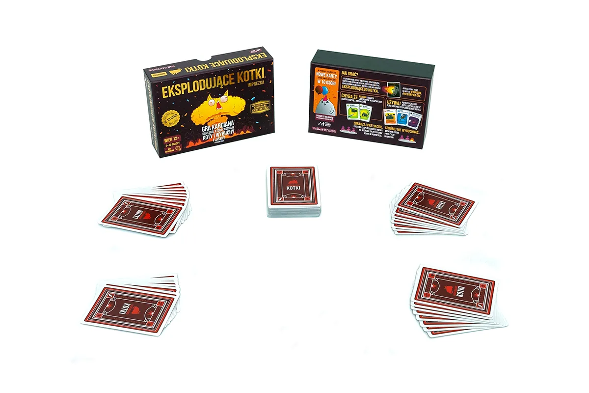 Jeszcze więcej kotów, jeszcze więcej wybuchów i jeszcze więcej znajomych przy jednym stole! Eksplodujące Kotki: Imprezka to rozbudowana edycja kultowej gry karcianej, stworzona z myślą o dużych grupach. Ta wersja zawiera aż 120 kart, co pozwala na wspólną zabawę nawet 10 osobom jednocześnie. Przygotuj się na dawkę kociego chaosu, który rozkręci każdą domówkę!