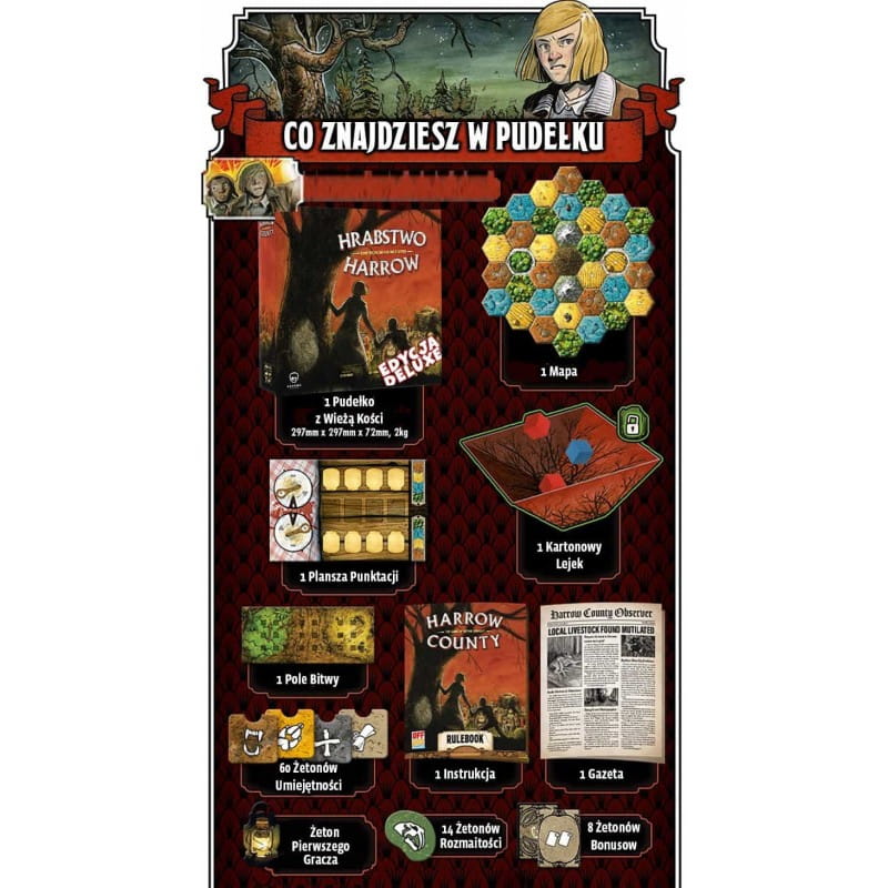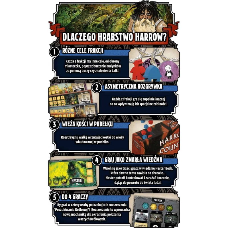 Hrabstwo Harrow to asymetryczna gra 1 vs 1, w której gracze kontrolują jedną z 3 frakcji (Obrońcy, Rodzina i Kammi), z których każda ma swój własny styl gry i cele. Gra zawiera również wariant dla trzeciego gracza – martwą wiedźmę Hester Beck, która jest pochowana pod drzewem i bardzo chce wrócić, by dokonać zemsty na mieszkańcach. Zamawiając polską edycję dostajecie wydanie deluxe zawierające dodatek “Poszukiwania Królowej”, umożliwiające rozgrywkę do 4 osób.