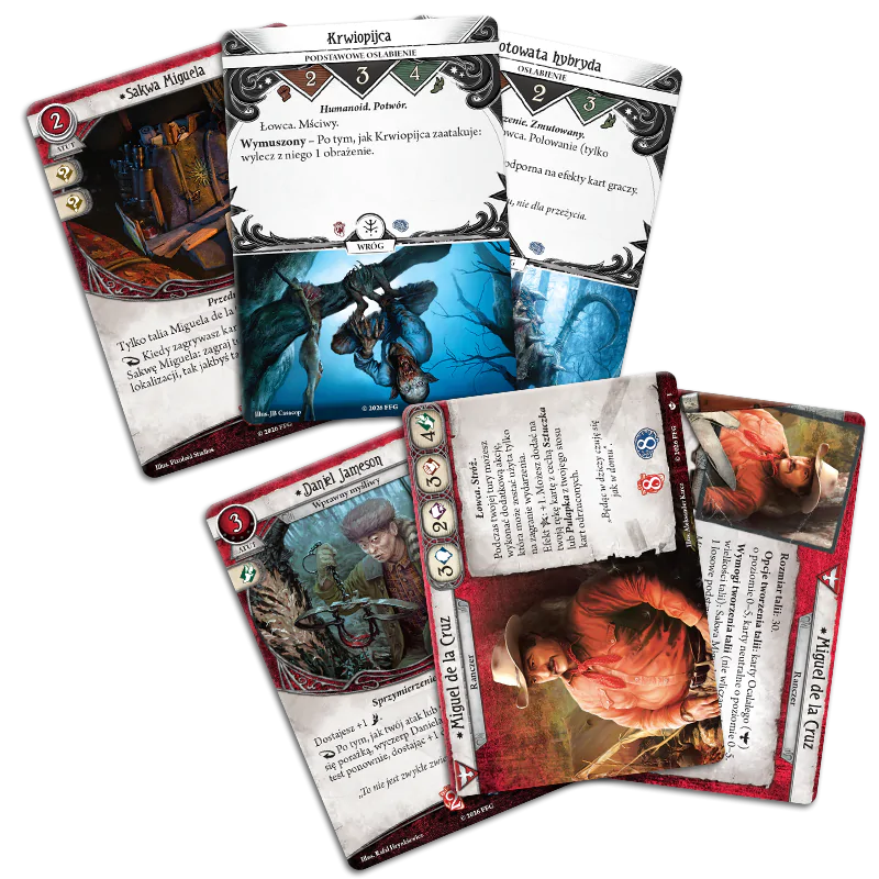Klimatyczne dodatki: Karty atutów i wydarzeń, które podkreślają ekspercki charakter Miguela jako tropiciela nieznanego.