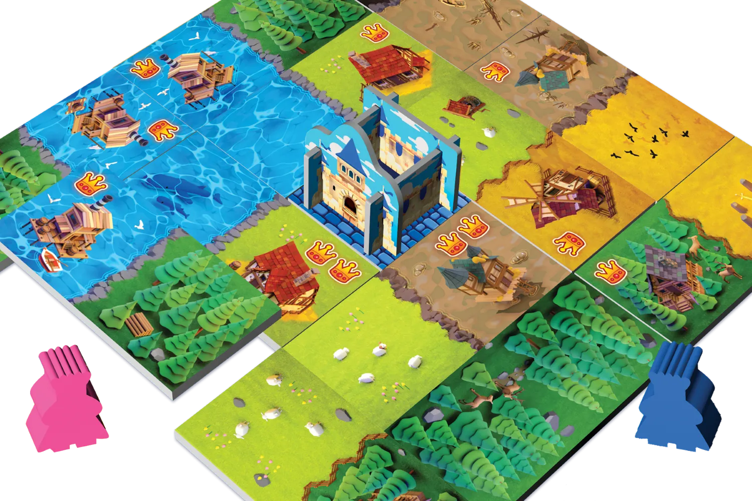Punktacja koronna: Na koniec gry podliczasz punkty za każdy spójny obszar (np. las). Wynik to liczba pól danego obszaru pomnożona przez liczbę widocznych na nich koron. Brak koron oznacza brak punktów, nawet za największy teren!