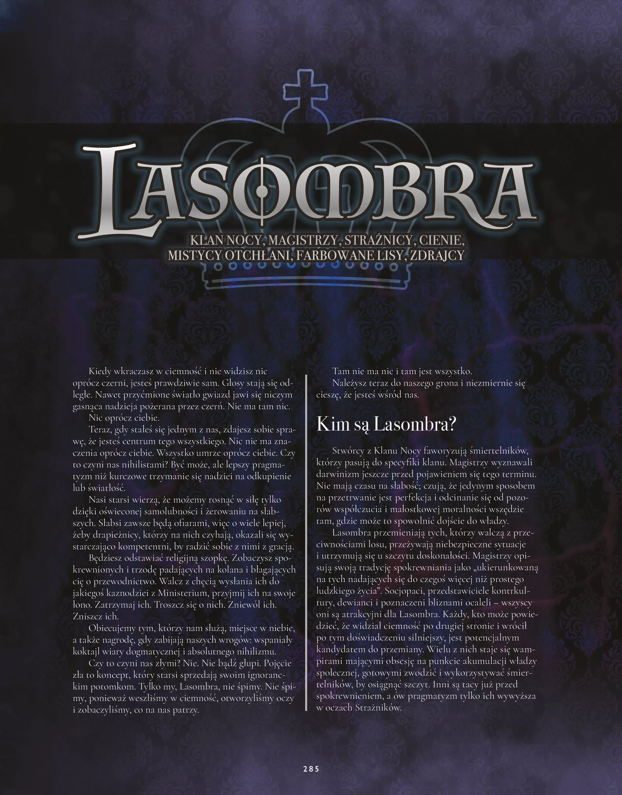 Klan Nocy wkracza do Gry: Poznaj historię przejścia klanu Lasombra w szeregi Camarilli. Podręcznik zawiera pełne zasady gry Stróżami, w tym unikalną Dyscyplinę Niepamięci.