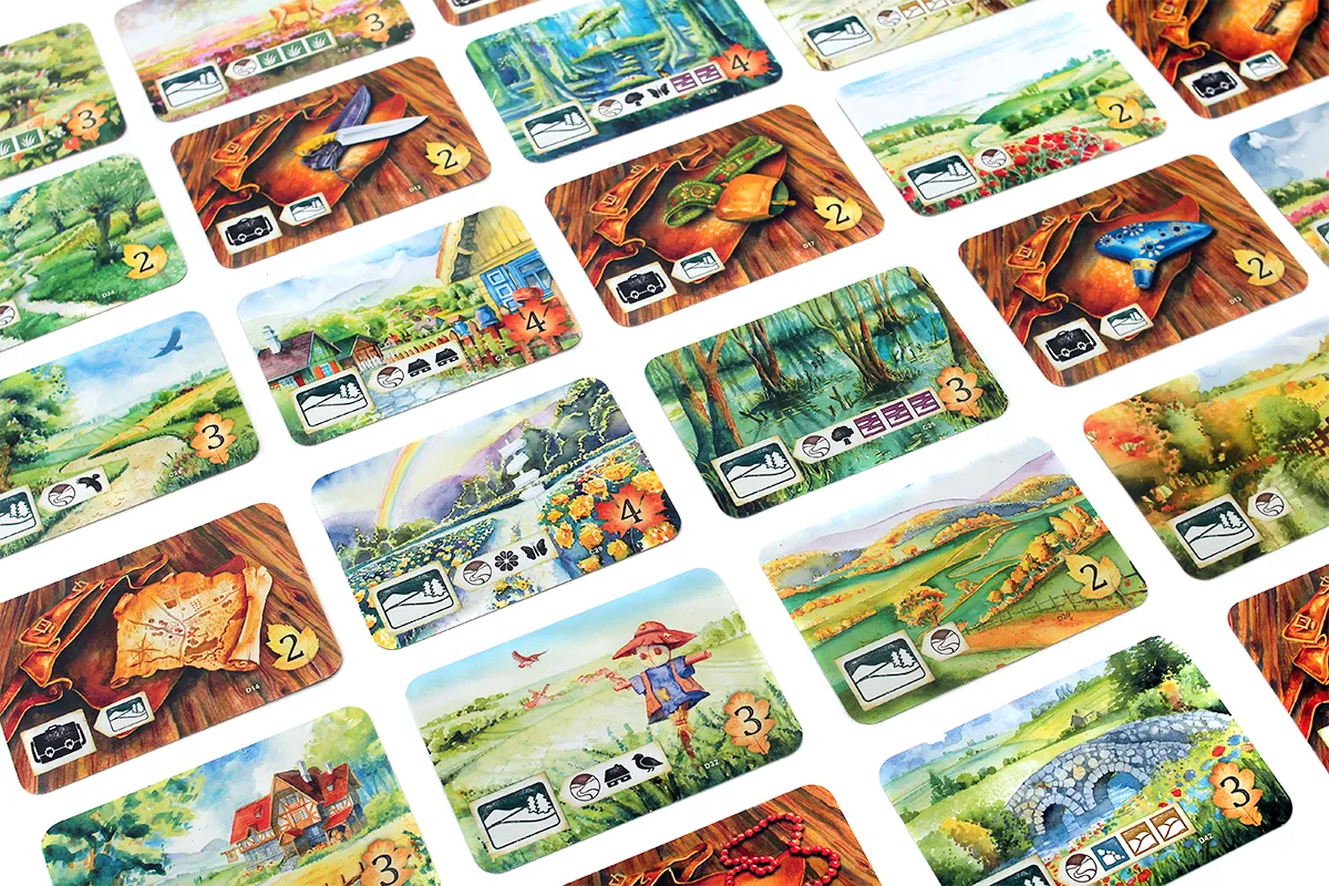 Elementem, który wyróżnia ten tytuł, jest ponad 200 unikatowych kart z autorskimi ilustracjami Karoliny Kijak. Każda grafika została wykonana techniką akwareli, co nadaje grze niepowtarzalnego, artystycznego charakteru. Dodatkowo do zestawu dołączony jest indeks przyrodniczy, dzięki któremu podczas zabawy poznasz ciekawostki o spotykanych gatunkach, takich jak myszołów, żmija czy ukryte w trawach gryzonie.