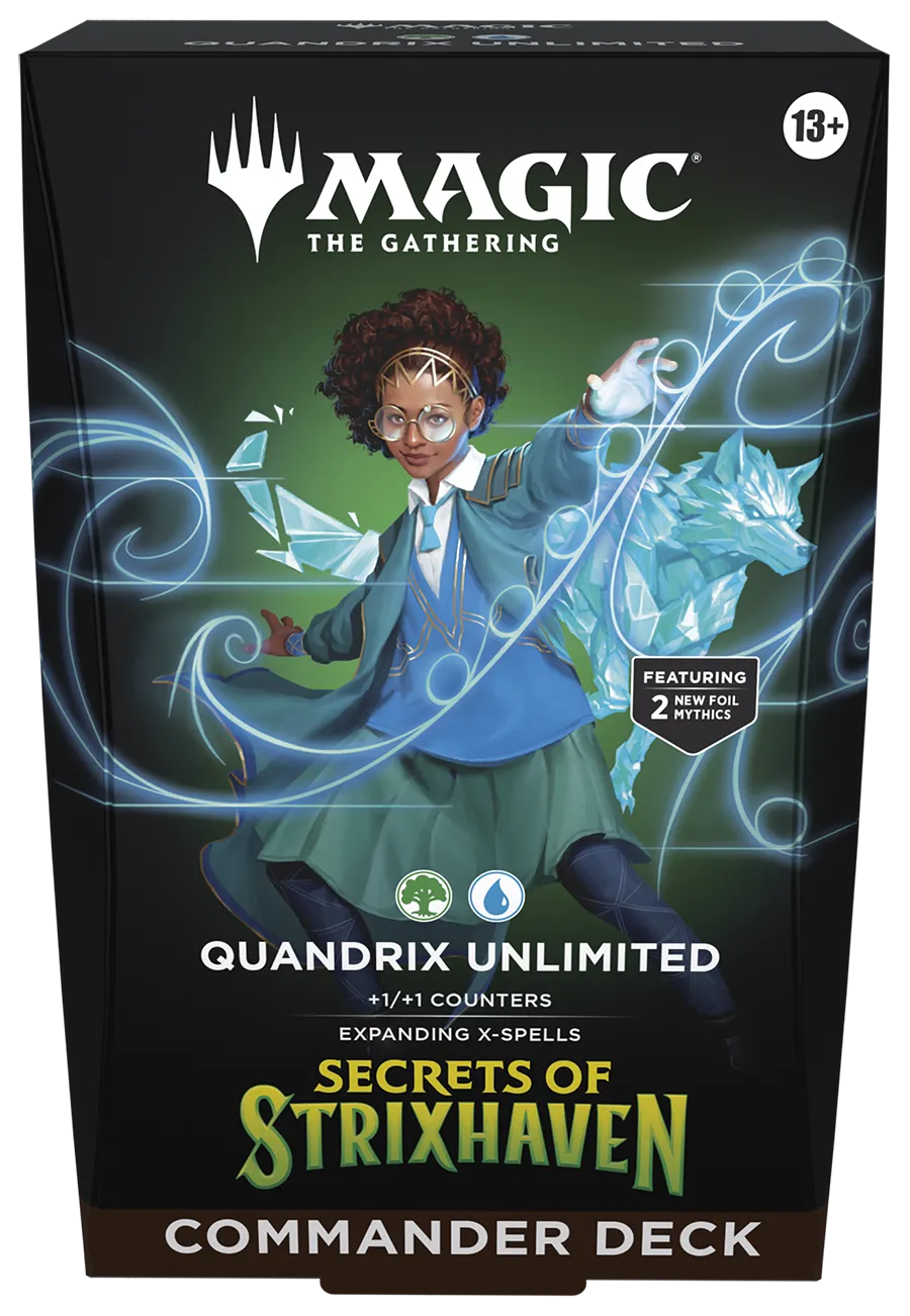 Magic the Gathering: Secrets of Strixhaven - Commander Deck - Quandrix Unlimited to gotowa do gry talia, która wprowadza Cię w świat najbardziej analitycznego kolegium w akademii Strixhaven. Magowie z Quandrix wierzą, że wszechświat można opisać za pomocą liczb, a ich magia polega na manipulowaniu wzorami natury. Przemierzaj korytarze uczelni i odkrywaj, jak dzięki matematycznej precyzji zwielokrotnić swoje siły. Jako student tego kolegium udowodnisz, że w świecie Arcavios liczby mają niszczycielską moc.