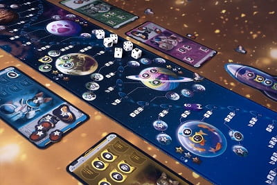 - O losach każdej wyprawy zadecydują kości – dowódca będzie nimi rzucał, a następnie decydował, które wykorzystać, by przemieścić się na planszy. Po każdym udanym locie możecie zdecydować, że Wasz koci astronauta opuszcza pokład rakiety i wysiada na danym księżycu lub planecie. W ten sposób gromadzicie punkty, bonusy i realizujecie cele.