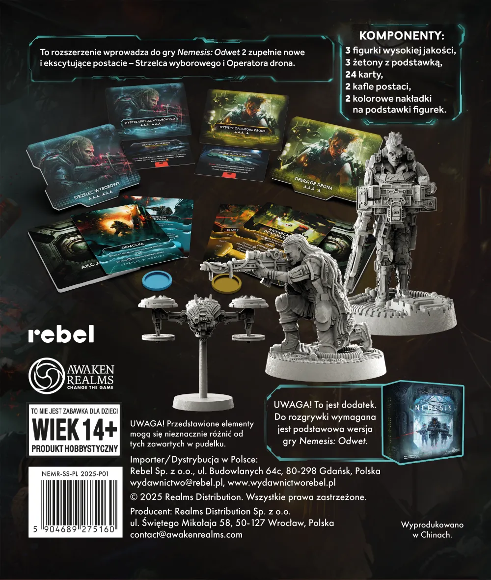 Wzmocnij swoje siły w walce z kosmicznym koszmarem i wprowadź do gry nowych ekspertów. Nemesis: Odwet – Oddział wsparcia to rozszerzenie, które zwiększa Twoje szanse na przetrwanie w opanowanej przez intruzów bazie. Do elitarnej jednostki dołączają dwie zupełnie nowe postacie: strzelec wyborowy oraz operator drona. Każdy z nich wnosi unikalne umiejętności i specjalistyczne wyposażenie, które pozwolą Twojemu zespołowi na stosowanie zupełnie nowych strategii defensywnych i ofensywnych.