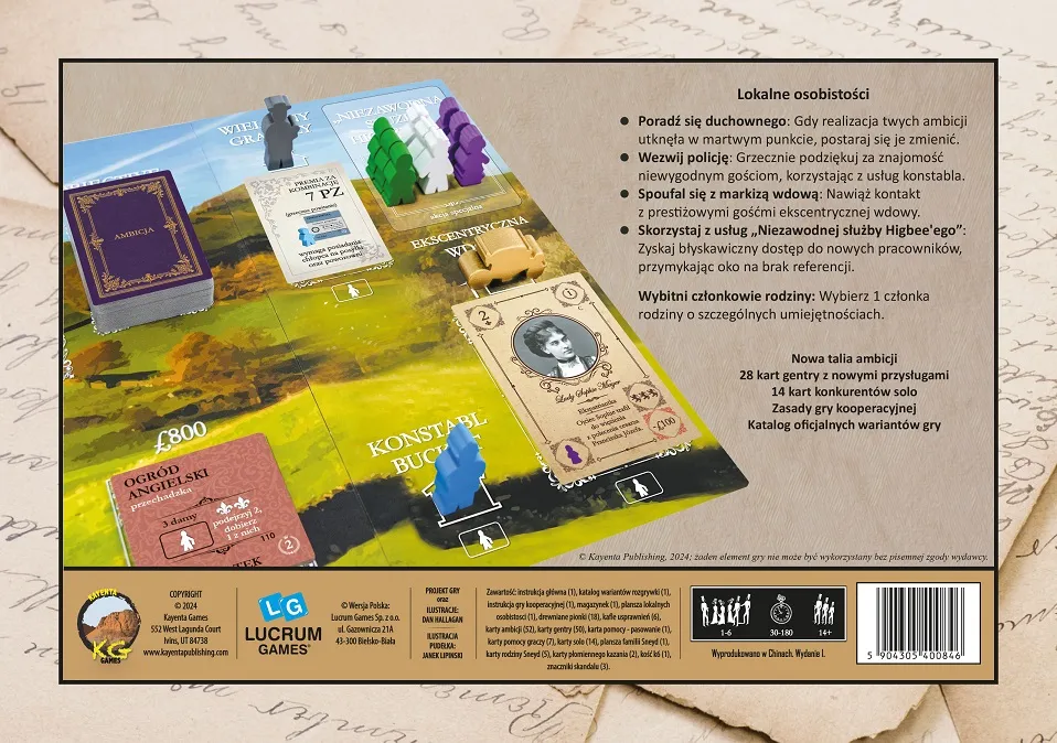 Unikalne postacie: Constable Bucket (odciąga niechcianych gości), Reverend Grantly (mądra pomoc), Dowager Marchioness (kontakt z arystokracją zagraniczną) — każda daje specjalną akcję pomagającą zarządzać posiadłością.
