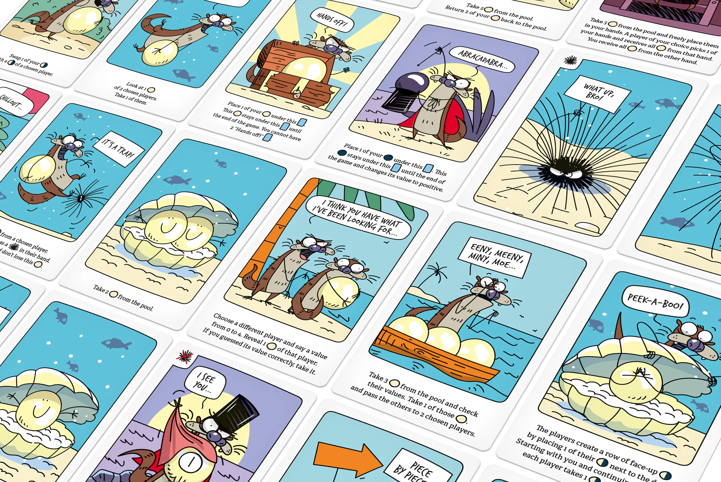 Otters is a tactical card game with simple rules where you step into the role of these clever and cunning animals. To win, you must collect as many precious pearls as possible. Get on your opponents' nerves, watch out for sea urchins, and remember: only one of you can be crowned the Master Pearl Diver!