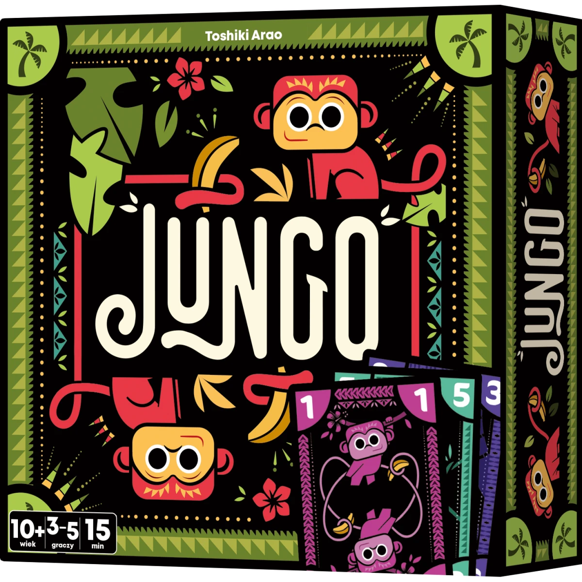 Zastanów się, które karty z ręki chcesz wyłożyć. Na stole jest już jakaś kombinacja? Spróbuj zagrać mocniejszą! A gdy Twoje karty zostaną przebite, przemyśl dobrze, czy wolisz dobrać je z powrotem, by wzmocniły Twoją rękę, czy jednak odrzucisz je, by choć odrobinę zbliżyć się do zwycięstwa. Jungo to ekscytująca gra oparta na zarządzaniu ręką. W swojej turze możemy dobrać kartę lub zagrać zestaw, jednak jeśli chcemy przebić kombinację znajdującą się na stole, musimy pamiętać o kilku zasadach, z których najważniejsza brzmi: nigdy, ale to nigdy nie zmieniaj położenia kart na ręce! Na czym to polega? Na początku rozgrywki każdy z uczestników otrzymuje na rękę określoną liczbę kart, których położenia nie może zmieniać. Następnie pierwszy gracz zagrywa jedną lub więcej identycznych kart z ręki, tworząc pierwszą kombinację. W swojej turze możemy dobrać kartę i umieścić ją w dowolnym miejscu na ręce, albo przebić zestaw na stole, zagrywając własny w ramach następujących zasad: Wszystkie zagrywane przez nas karty muszą mieć tę samą wartość. Nasza kombinacja musi być mocniejsza, czyli musi zawierać więcej kart niż ta wyłożona na stole lub taką samą ich liczbę, ale o wyższej wartości. Możemy zagrywać tylko karty, które znajdują się obok siebie na naszej ręce. Gdy nasz zestaw zostanie przebity, możemy odrzucić składające się na niego karty lub wziąć je z powrotem na rękę i umieścić w dowolnych miejscach, by wzmocnić nasze kombinacje. Zwycięży osoba, która jako pierwsza pozbędzie się wszystkich kart. Dlaczego pokochasz tę grę? Jungo to dynamiczna i angażująca zabawa, do której z łatwością zaprosimy nowe osoby. Jest w pełni niezależna językowo, a poręczne pudełko pozwala zabrać grę absolutnie wszędzie. Podstawowe zasady są niezwykle proste: musimy jedynie pamiętać o regułach przebijania zestawów oraz o tym, by pod żadnym pozorem nie zmieniać położenia kart na ręce. Ostatnia zasada jest szczególnie ważna i to ona sprawia, że na każdym etapie mamy do podjęcia istotne decyzje. Odrzucanie kart przybliża nas do zwycięstwa, jednak z drugiej strony przywracanie ich na rękę wzmacnia nasze kombinacje i pozwala wykonywać spektakularne ruchy później.