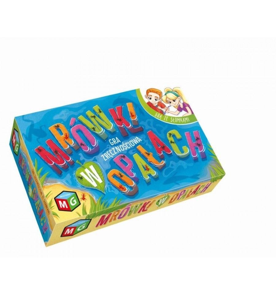 Zawartość pudełka: słomki - 6 szt., żetony: mrówki robotnice - 100 szt., żetony: mrówki strażniczki - 19 szt, żeton: królowa mrówek - 1 szt., klepsydra - 2 szt., tabliczki z wysepką - 6 szt., kolorowa kostka - 1 szt., instrukcja.