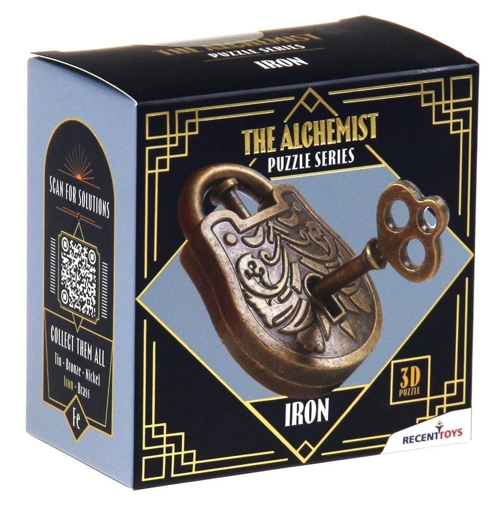 The Alchemist Puzzles to nowa seria łamigłówek z wydawnictwa Recent Toys. Wspólnym celem alchemików było odkrycie metody zamiany ołowiu w złoto, lekarstwa na wszelkie choroby oraz eliksiru nieśmiertelności. Twoje zadanie będzie prostsze (tak nam się wydaje). Skorzystaj z pomocy dołączonego klucza i spróbuj otworzyć żelazną kłódkę. Ciekawostka: żelazo to mocny, magnetyczny metal, który jest głównym składnikiem stali i jest szeroko stosowany w budownictwie i produkcji. Recent Toys to producent łamigłówek z Holandii. Jak sami o sobie mówią: "Tworzą zagadki dla wszystkich." Jeżeli lubisz matematykę, logikę, układanie wzorów lub po prostu jesteś cierpliwy i wytrwały, to na pewno znajdziesz coś dla siebie! Choć wszystkie łamigłówki są unikatowe to mają one następujące cechy wspólne: 1. Prostota - zagadki są łatwe do wytłumaczenia. Nasz umysł ma się skupić na rozwiązaniu łamigłówki, a nie na zrozumieniu zasad. 2. Mądrość - łamigłówki są zaprojektowane tak, aby zmusić nasz umysł do poszerzenia horyzontów i otwarcia na nowe pomysły. 3. Wytrzymałość - łamigłówki zbudowane są z odpowiednich materiałów. Elementy można przesuwać z wyjątkową łatwością. Chodzą płynnie, szybko i się nie zacinają. ZAWARTOŚĆ: łamigłówka Iron (Żelazo) - poziom 4/5
