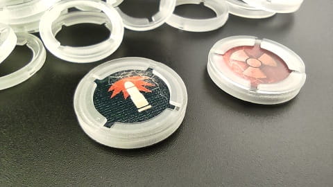 Zestaw przezroczystych protektorów (osłonek) na żetony o średnicy 22 mm.