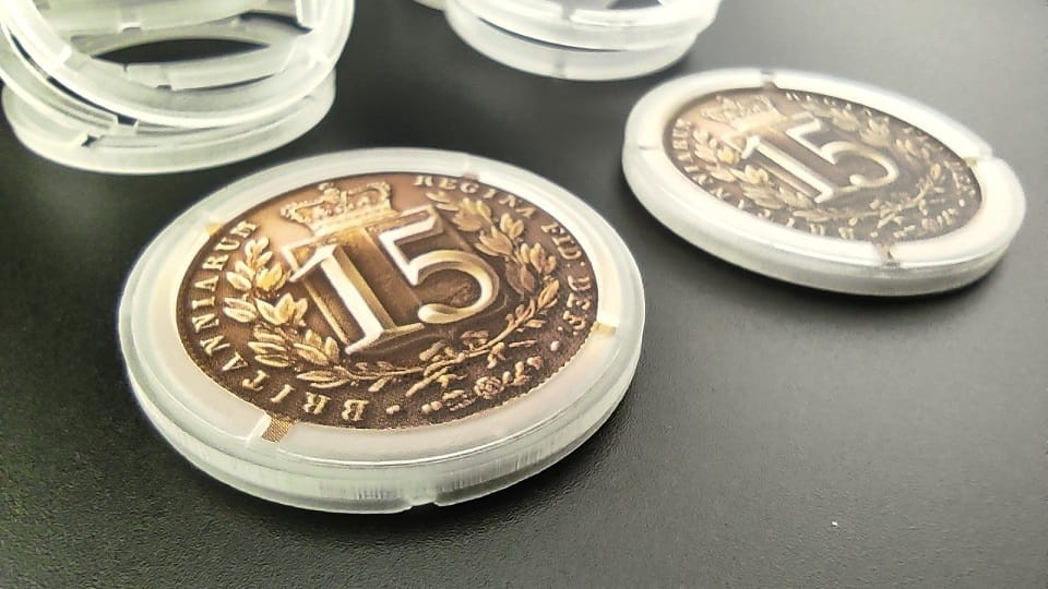 Zestaw przezroczystych protektorów (osłonek) na żetony o średnicy 37 mm.