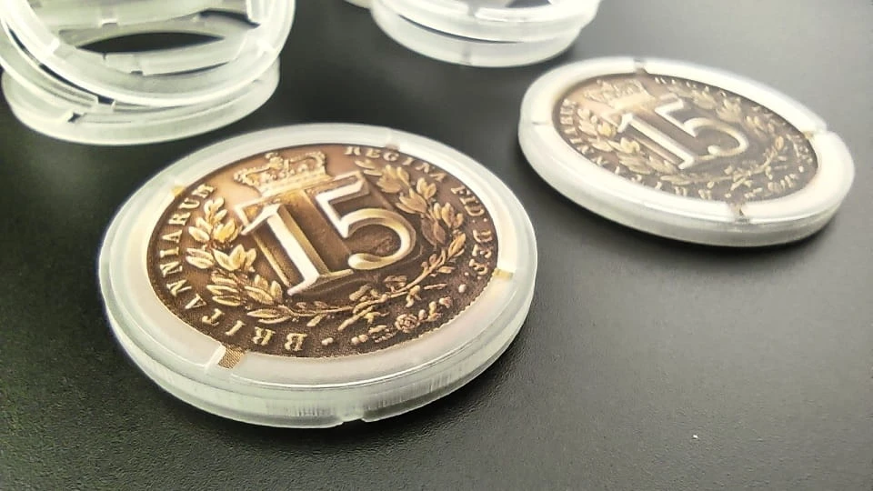 Zestaw zawiera 21* podwójnych protektorów w których zamyka się żeton jak w kapslu numizmatycznym.