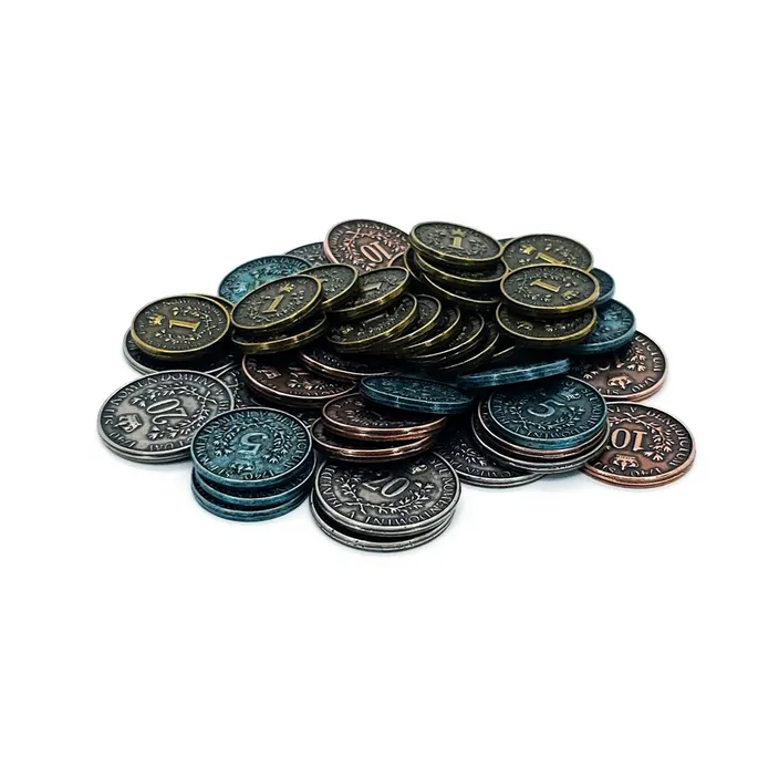Zestaw został zaprojektowany tak, aby monety były nie tylko piękne, ale przede wszystkim praktyczne podczas dynamicznej rozgrywki. Każdy nominał różni się rozmiarem, co ułatwia szybką orientację w stanie skarbca Twojej pracowni: