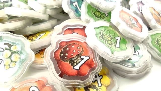 Przedstawiamy zestaw protektorów idealnie dopasowanych kształtem i rozmiarem do żetonów składników z gry planszowej Szarlatani z Pasikurowic!