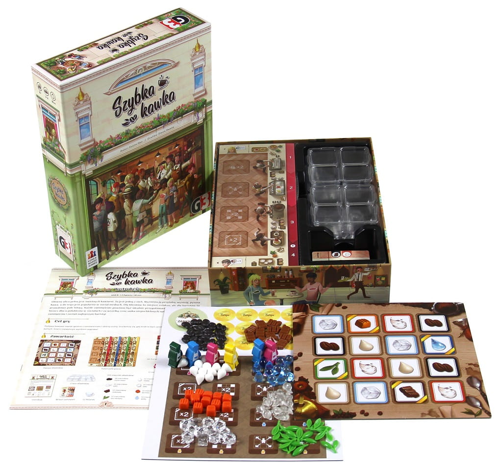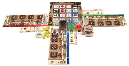 Ruch po planszy składników: W swojej turze przesuwasz pionek o 1 do 3 pól. Każde pole, przez które przechodzisz, daje Ci konkretny składnik (kawę, mleko, lód, czekoladę itd.). Musisz planować trasę tak, by zebrać dokładnie to, czego potrzebują Twoi klienci.