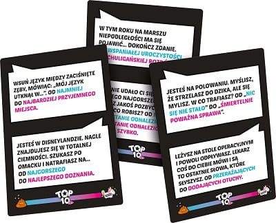 Współpraca, kreatywność i zabawa to Twoje ulubione elementy, a lubisz czarny humor i sprośne żarty? Zbierz znajomych i spróbuj swoich sił w nowej wersji Top 10! To oryginalna gra skojarzeniowa, w której możesz uwolnić swoją wyobraźnię. Twoim celem jest przetrwanie 5 rund. Aby to osiągnąć, musicie sprawnie wymyślać hasła, odzwierciedlające Wasze miejsca w szeregu! Gdy kapitan odkryje temat zajawki, każdy uczestnik otrzymuje liczbę od 1 do 10, wskazującą, gdzie pomiędzy tymi dwoma zakresami powinno znaleźć się wymyślone hasło. Na podstawie odpowiedzi graczy kapitan musi odgadnąć kolejność wylosowanych liczb. Za każdy popełniony błąd tracisz jeden żeton jednorożca!