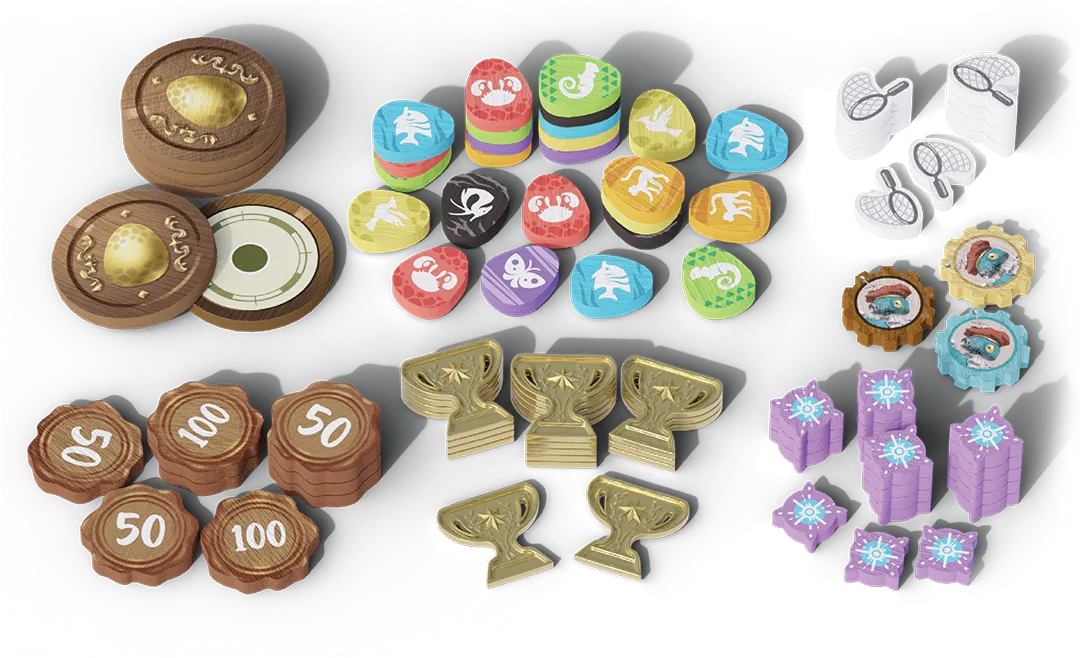 Drewniane akcesoria: Siatki na motyle, znaczniki czasu, celu oraz punktacji – wszystko wykonane z naturalnego surowca.