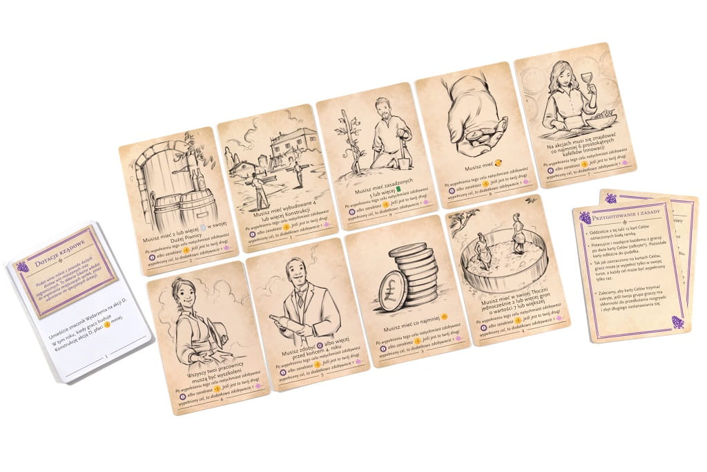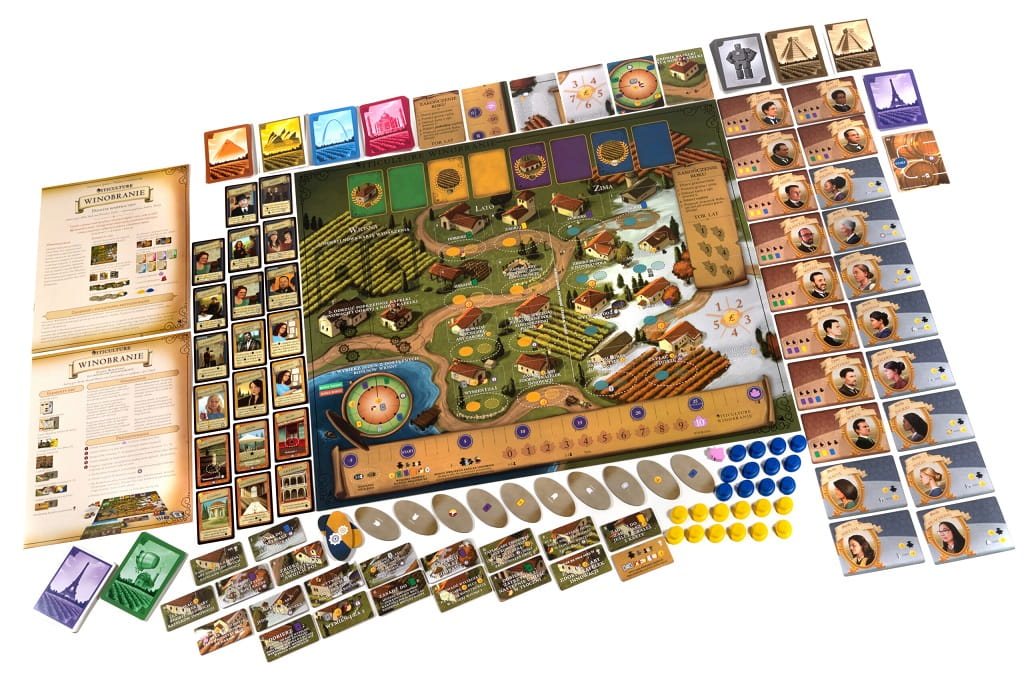 Korzystając z nowej planszy, płytek, znaczników i kart wydarzeń z oryginalną planszą i kartą Winnicy, masz 6 lat na spełnienie dwóch warunków wymaganych do wygrania wybranym regionie: – każdy gracz musi zdobyć 25 Punktów Zwycięstwa i wspólny znacznik wpływów musi dotrzeć do końca toru wpływów. W tej grze kooperacyjnej wszyscy gracze wygrywają lub przegrywają!