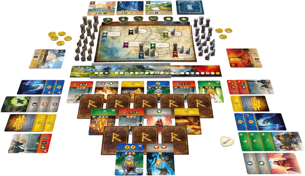 W zależności od koloru, karty zapewniają różne bonusy. Szare reprezentują umiejętności, którymi opłacamy koszt kart i płytek, żółte zapewniają monety, niebieskie pozwalają przesuwać się na torze Wyprawy Pierścienia, gdzie ścigamy się z przeciwnikiem, zielone pozwalają nawiązywać sojusze z rasami Śródziemia, a czerwone umożliwiają rozmieszczanie jednostek. W ostatnim rozdziale są też dostępne specjalne, fioletowe karty o potężnych efektach.