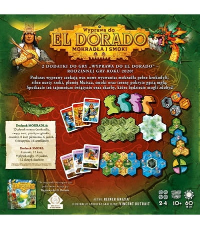 Wyprawa do El Dorado: Mokradła i Smoki to nie tylko dodatek, ale w pełni niezależna gra, którą można łączyć z pierwowzorem, tworząc epickie mapy. Wprowadza ona nowe, ekscytujące moduły. Gracze muszą zmierzyć się z trudnym terenem mokradeł, gdzie nurt rzeki może pokrzyżować plany, oraz unikać groźnych smoków, które blokują drogę do złotego miasta. Gra oferuje ogromną regrywalność dzięki modułowej planszy, którą można układać na tysiące sposobów, oraz nowym kartom wyprawy i artefaktów.